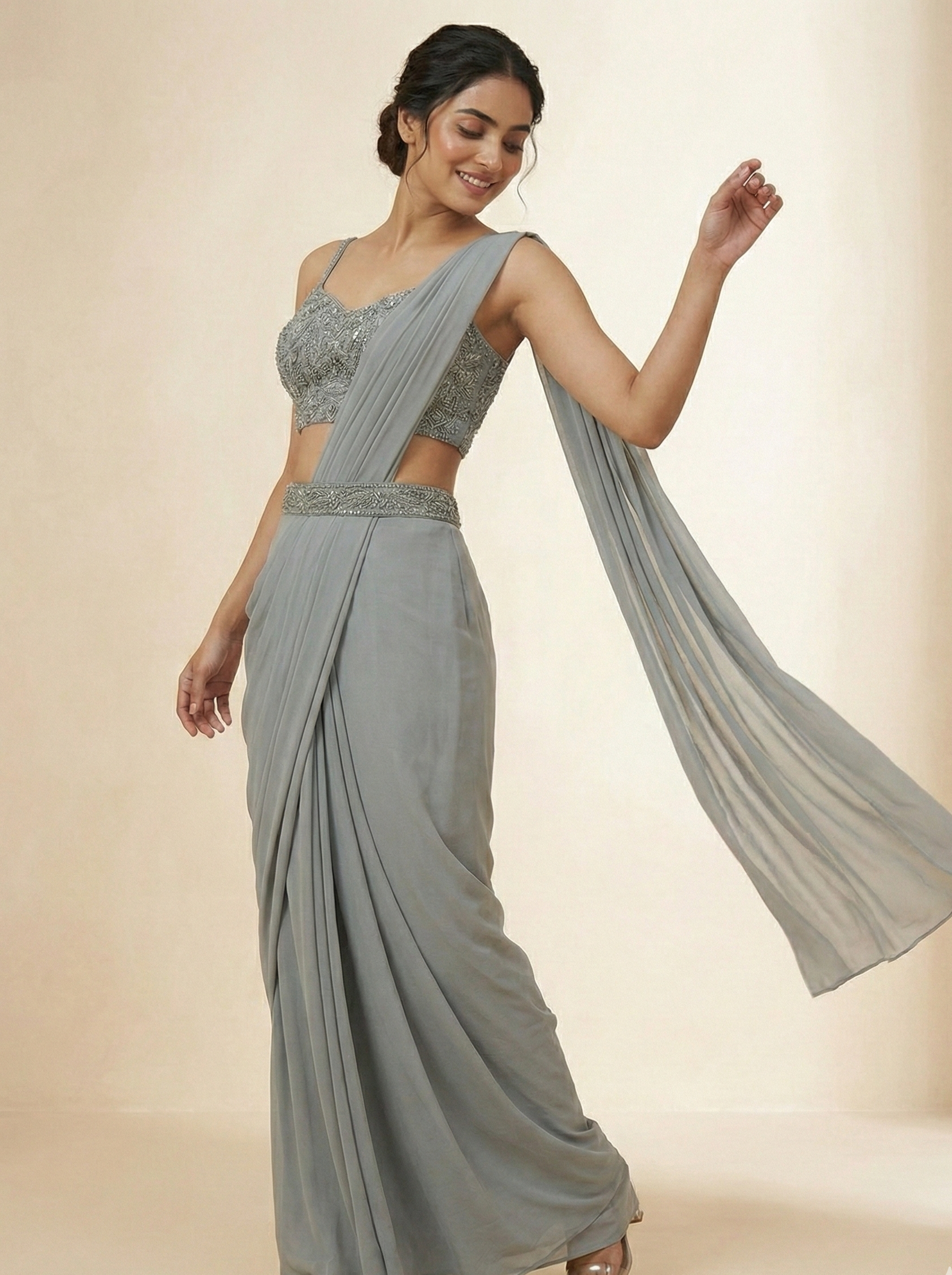 This elegant grey drape saree set features a beautifully embroidered blouse paired with a soft pre-draped skirt. Made in pure crepe fabric, the outfit is lightweight, comfortable, and falls gracefully on the body. The subtle embroidery adds a festive touch while keeping the look classy and modern.