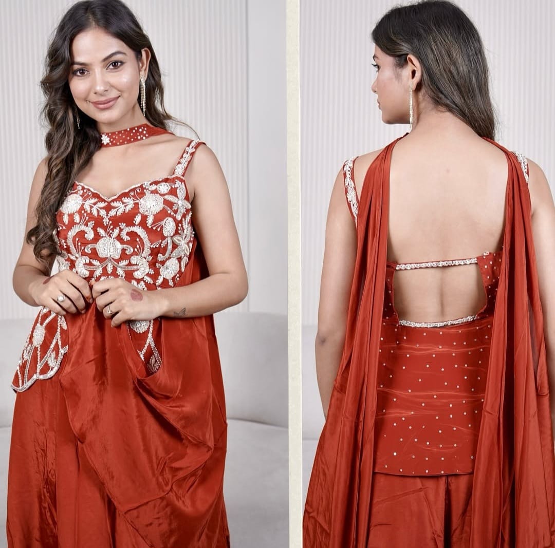 Grace meets bold sophistication — this rust paplam set is a modern expression of tradition. Featuring a beautifully structured silhouette with intricate white thread and sequin embroidery, it pairs timeless charm with a contemporary flair. The paplam-style peplum blouse flatters the frame, while soft drapes lend effortless movement and grace.